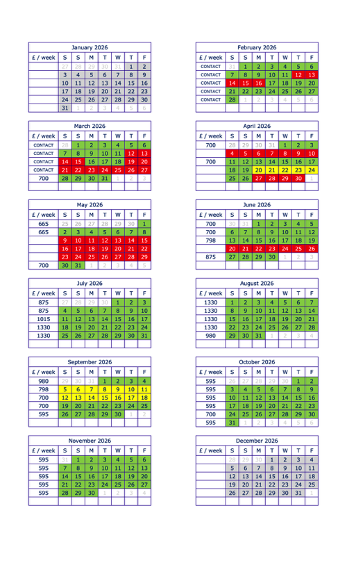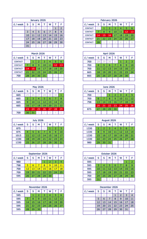 Please check the availability calendar below for the Year 2026. Price per week is shown in the first column.